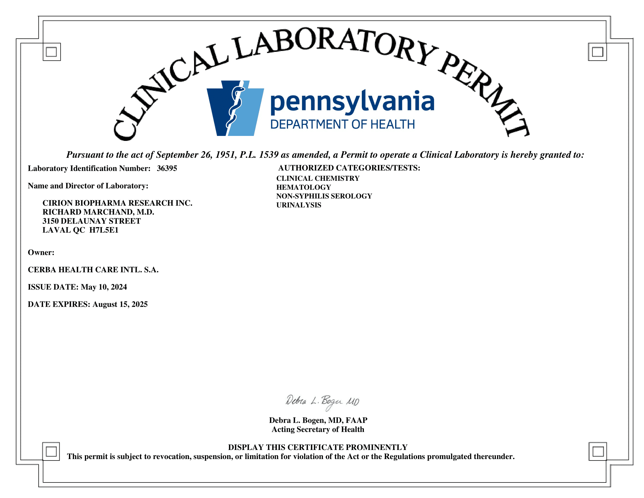 CLIA Permit Pennsylvania CIRION